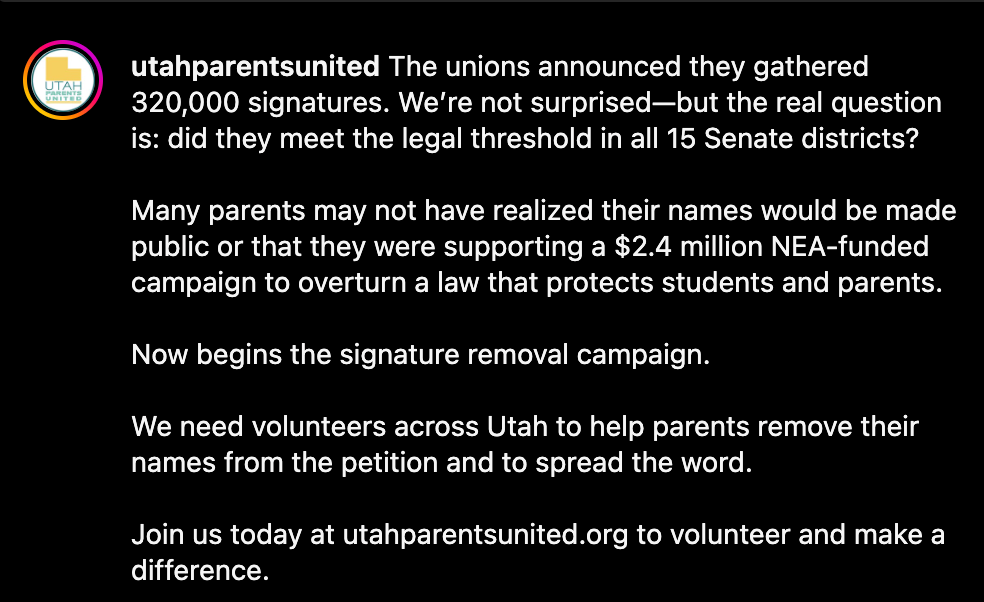 Groups like Utah Parents United and Americans for Prosperity are running digital ads, radio spots, billboards, TV commercials, and mass texting campaigns to convince people to remove their names from the petition. As soon as your signature is verified and posted, their 45-day clock to get it removed starts. And you best believe they will start calling you and showing up at your door. They’ll try to guilt you, confuse you, or wear you down.