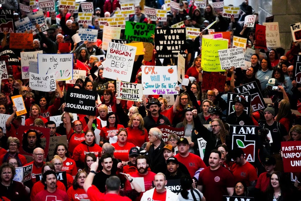 Unlike other controversial bills that quietly sneak through the Utah Legislature, HB267 drew massive attention. Thousands of public comments flooded in. Overflow rooms filled up during committee hearings. Teachers, firefighters, nurses, construction workers, and other union members from across the state showed up to protest. There were signs, chants, even songs. Democracy was very much happening.