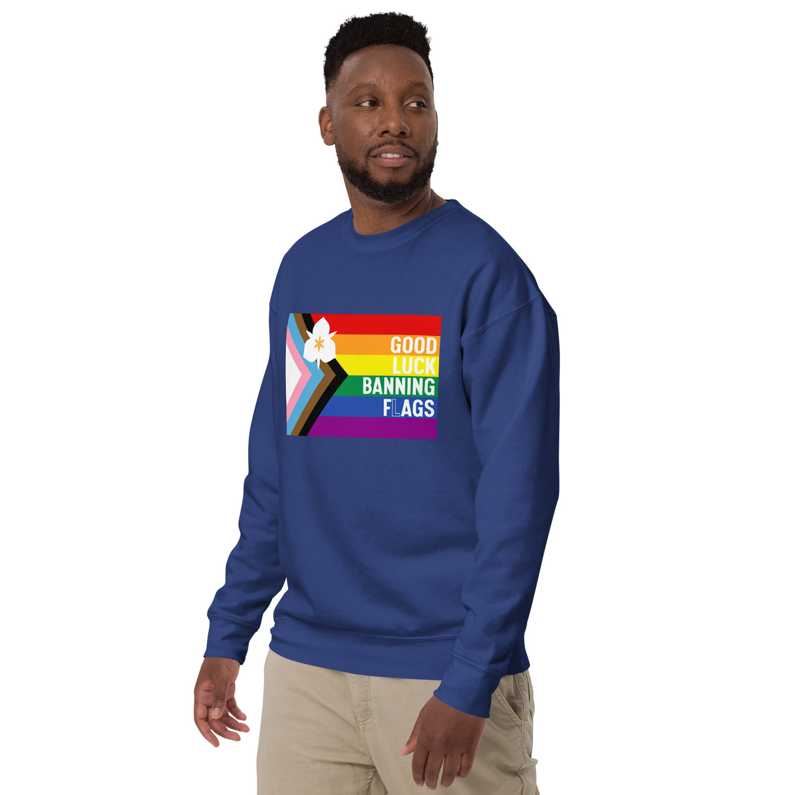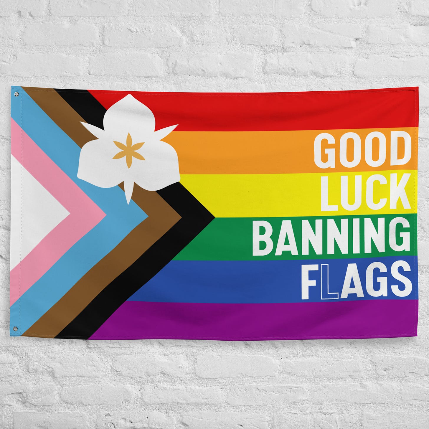 It says flags. Obviously. The “L” is just... transparent. This design exists because we all know this was never about flags. It was never about rainbows. It was always about a continued attempt to silence queer people, erase them, make them feel alone, make them feel hopeless. Because maybe if we “disagree better” with their “lifestyle”, they’ll just go away. That’s what this has always been about, and it will never work. Not ever. In fact, the more you try to push us away, the louder we become. Maybe they can ban our flag, but they’ll never ban us. So, say it without saying it. And say it everywhere.