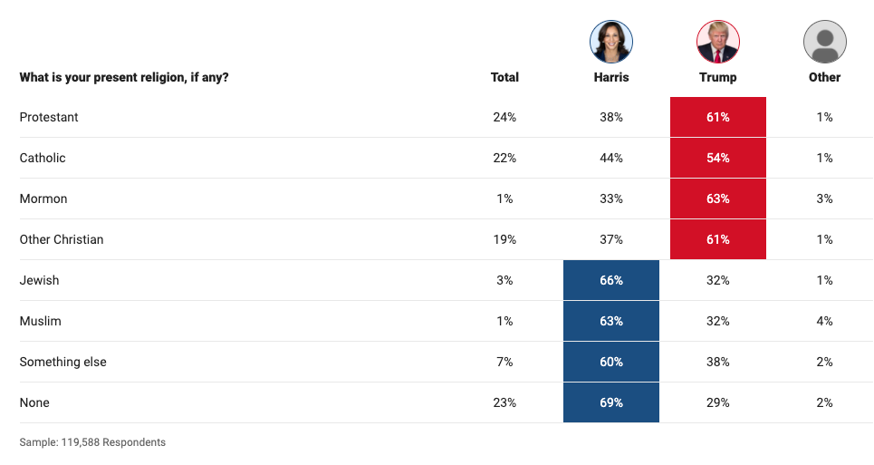 One of the most notable factors in this shift is a change in voting patterns among LDS voters, particularly younger LDS voters. According to exit polling from Fox News, LDS voters were the only religious group where Harris saw an increase in vote share, moving from 23% for Biden in 2020 to 33% this year. This builds on a trend we saw in 2020, where nearly half (47%) of LDS voters under 40 voted for Biden, showing a clear break from the historically Republican loyalty of the LDS community. This isn’t just a blip—it’s the beginning of what could be a significant realignment.