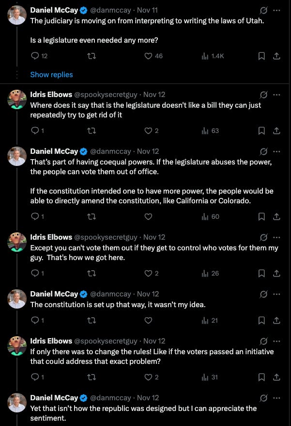 First: “One unelected judge”? Judge Gibson was appointed by Republican Governor Gary Herbert in 2018 and confirmed unanimously by the Republican-controlled Utah Senate. In 2022, the Judicial Performance Evaluation Commission voted unanimously that she exceeded performance standards, and 75% of voters approved keeping her on the bench. Not to mention the fact that this one judge was following the ruling and standards set by the Utah Supreme Court, which is made up of five (5) people who were all appointed by Republican Governors and confirmed by the Republican-controlled Utah Senate.