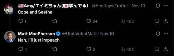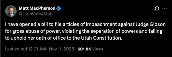Rep. Matt MacPherson (R-26) tweeted at 12:01 AM, exactly 16 minutes after Judge Gibson’s 91-page ruling dropped at 11:45 PM, that he had “opened a bill to file articles of impeachment against Judge Gibson for gross abuse of power, violating the separation of powers and failing to uphold her oath of office to the Utah Constitution.”